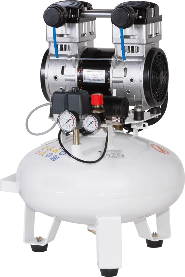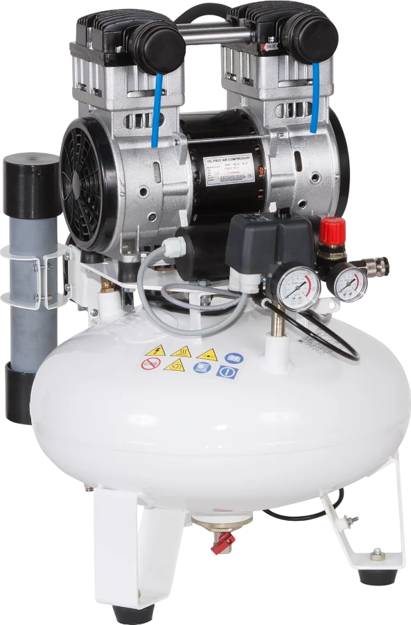 Бесшумные безмасляные поршневые компрессоры — это устройства для получения сжатого воздуха без твёрдых частиц, водяных паров, других загрязнений. Основное отличие от маслозаполненных моделей — отсутствие прямого контакта воздушной среды со смазочным материалом. Это позволяет сохранить высокую чистоту воздуха на выходе из компрессора.